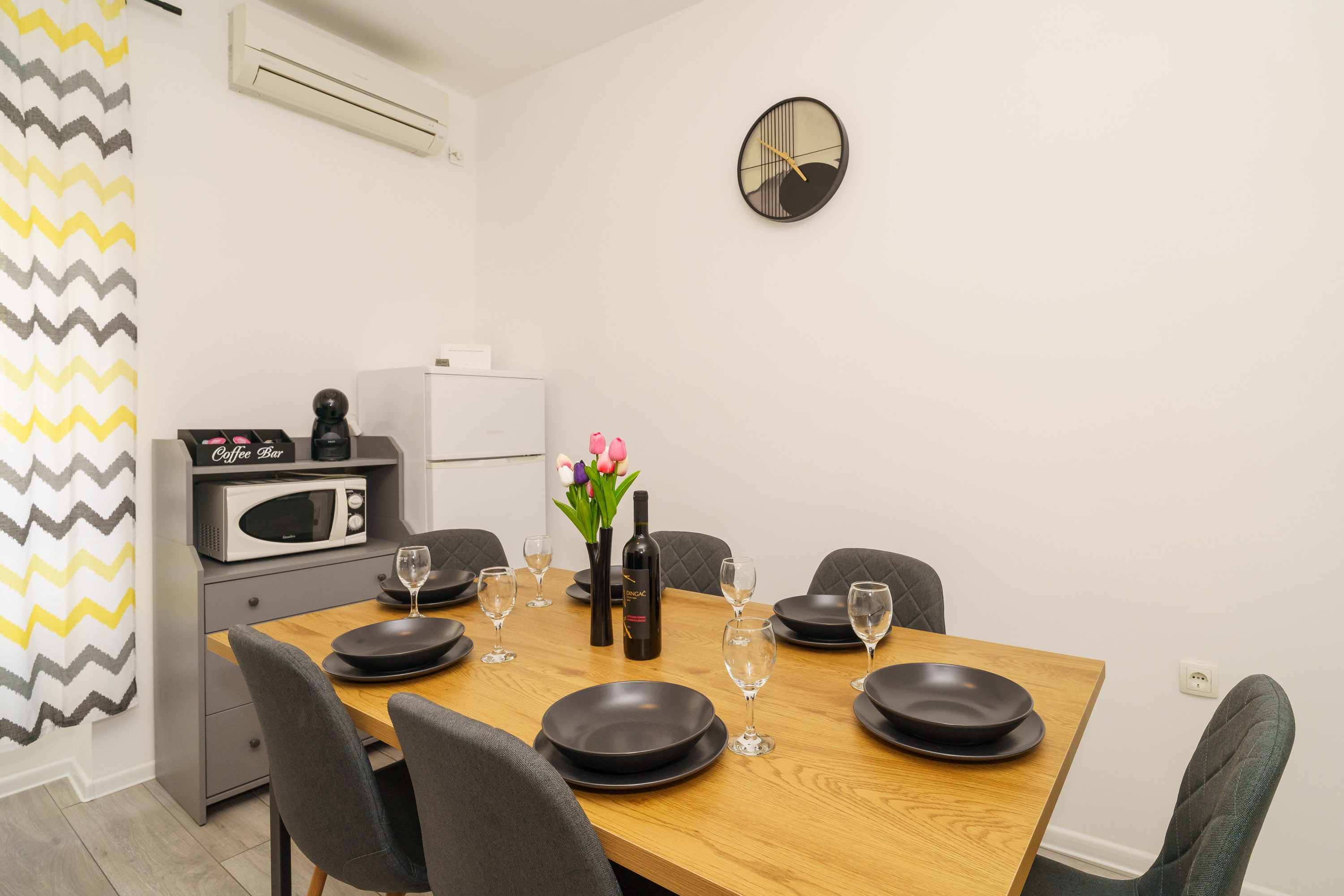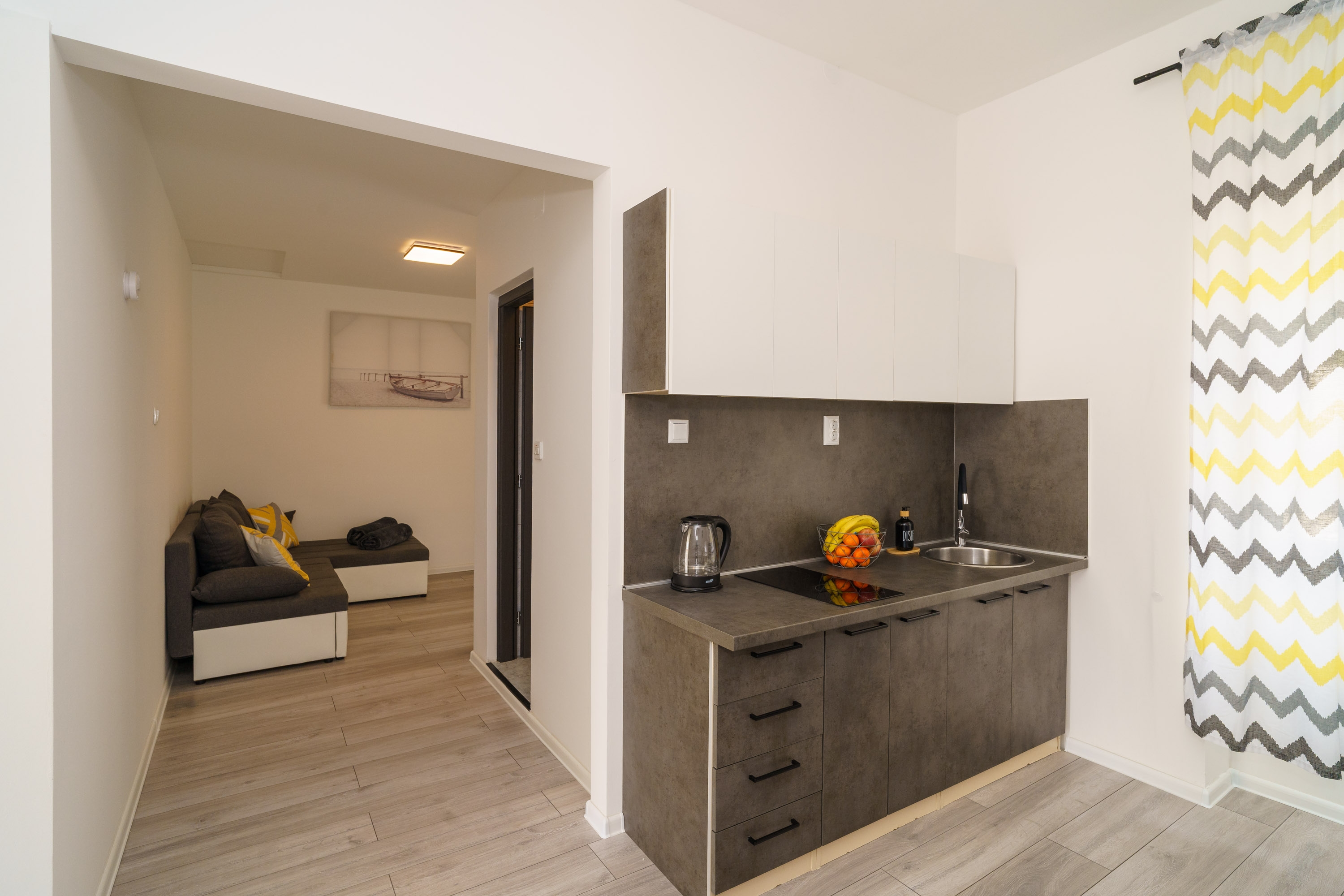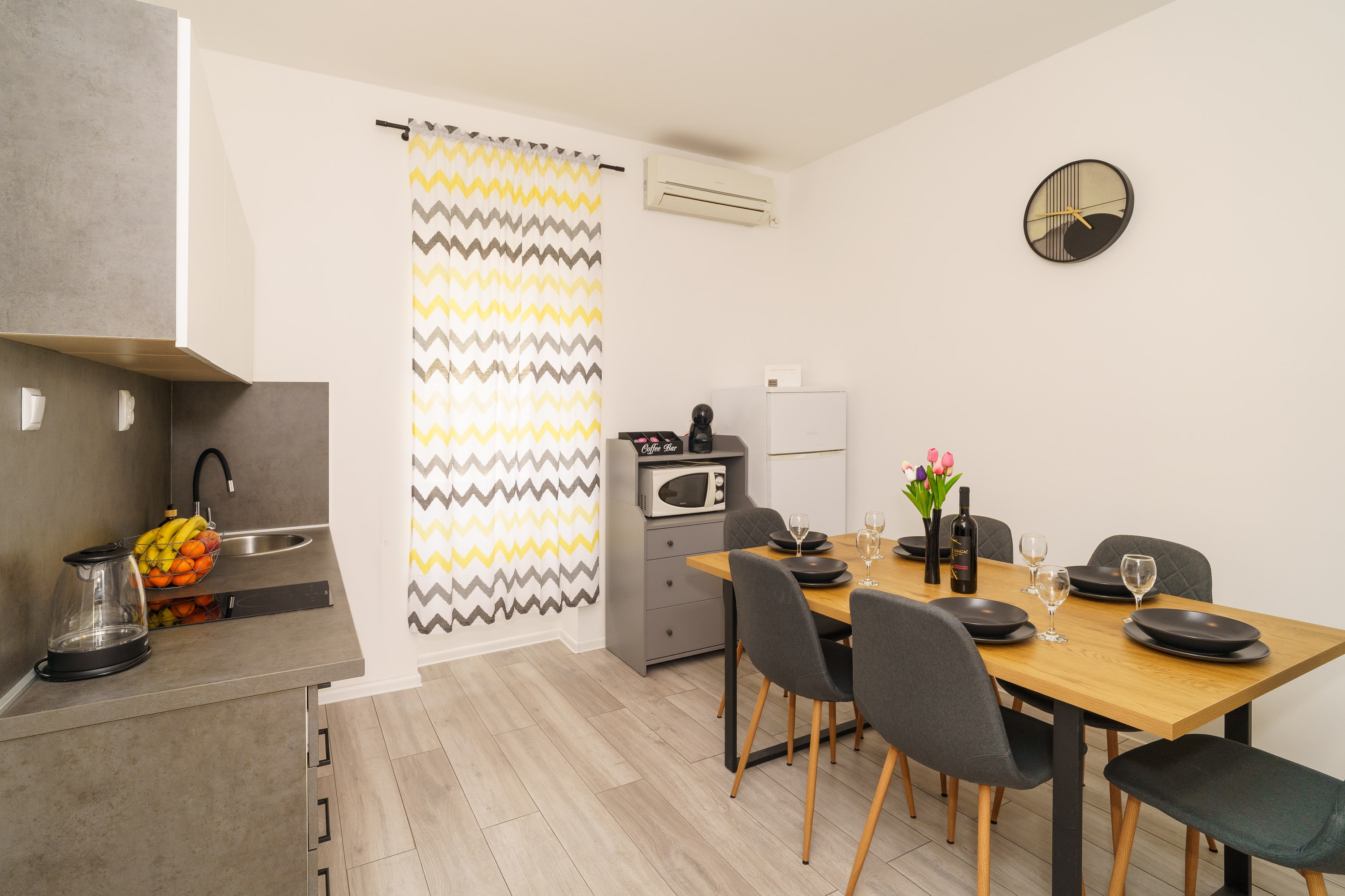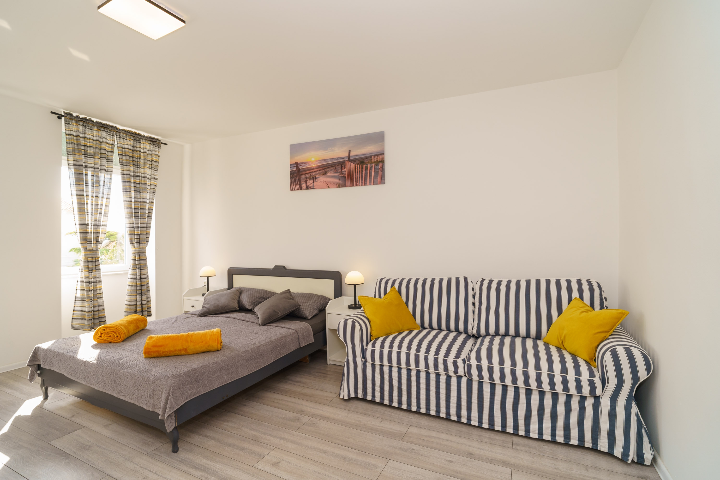 Apartment can accommodate 6 guests. Beds are situated in 2 sleeping rooms, within 65m2. Food can be prepared using barbecue which is shared with other guests too. There is no balcony or terrace in the reserved accommodation unit. INCLUDED IN THE PRICE: tourist tax, final cleaning, air-conditioning, parking, internet, baby cot. OPTIONAL ADDITIONAL COSTS: garage (€10.00 per night), bicycle (€15.00 daily (per piece)). The availability of additional services for your chosen dates of stay, as well as their prices (if none are listed) must be checked ahead of time. Any additional services not shown in the price calculation are payable directly to the property owner and only if used by the visitor.