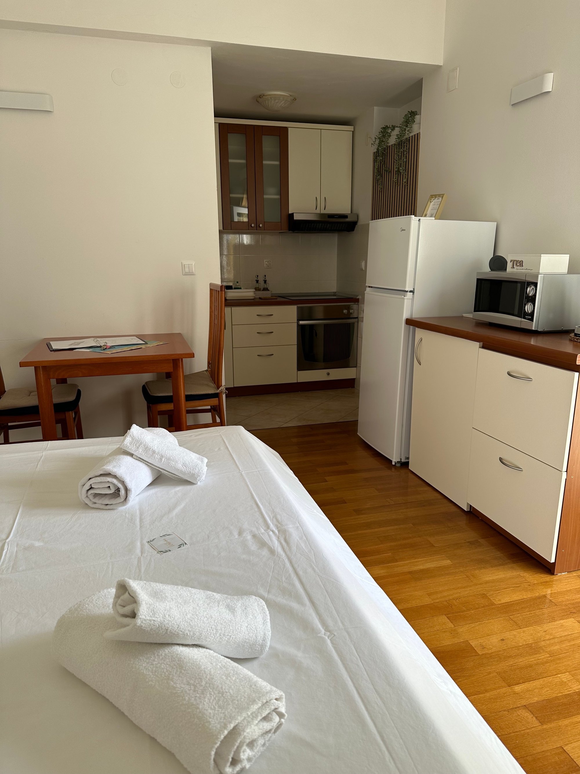 Studio flat can accommodate 2 guests. Beds are situated in 1 sleeping rooms, within 21m2. Guests can use a private terrace to enjoy the warm summer evenings. Food can be prepared using barbecue which is shared with other guests too. INCLUDED IN THE PRICE: tourist tax, final cleaning, air-conditioning, parking, internet, baby cot, iron, ironing board, hairdryer, portable barbecue. OPTIONAL ADDITIONAL COSTS: laundry (€5.00 washing), additional bed (€10.00 per night). The availability of additional services for your chosen dates of stay, as well as their prices (if none are listed) must be checked ahead of time. Any additional services not shown in the price calculation are payable directly to the property owner and only if used by the visitor.