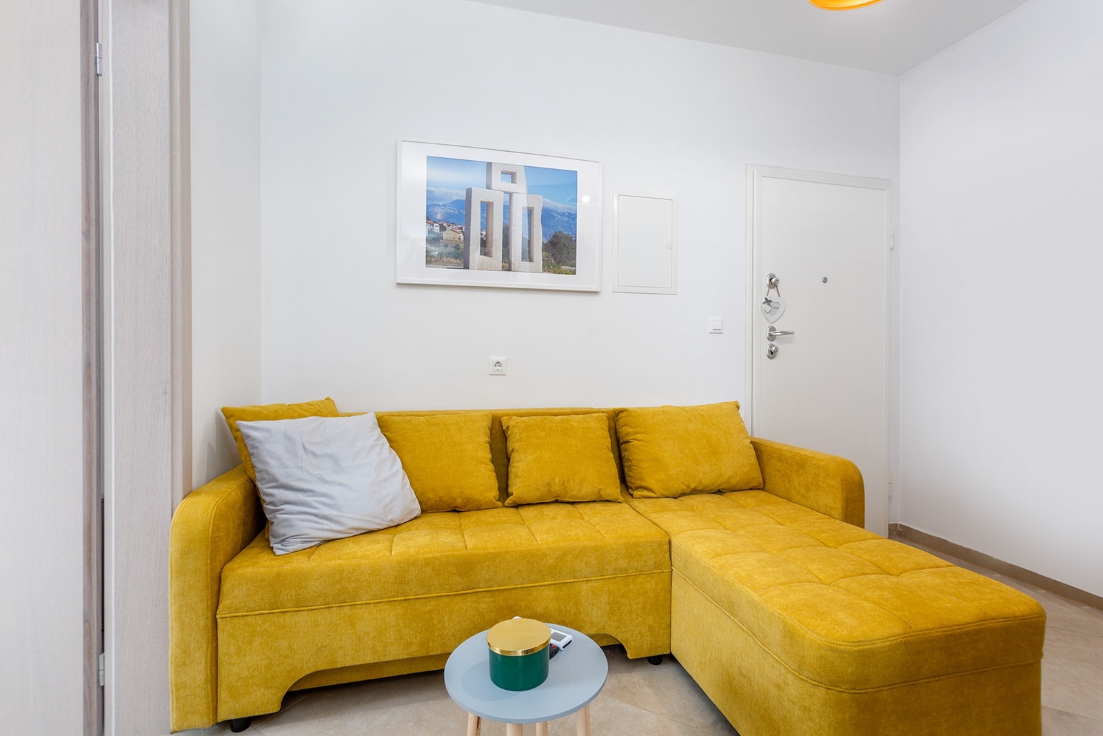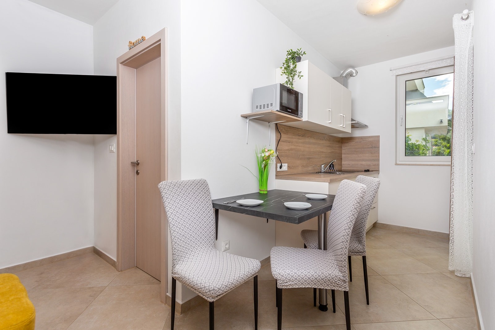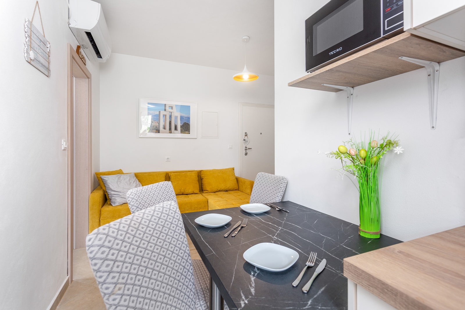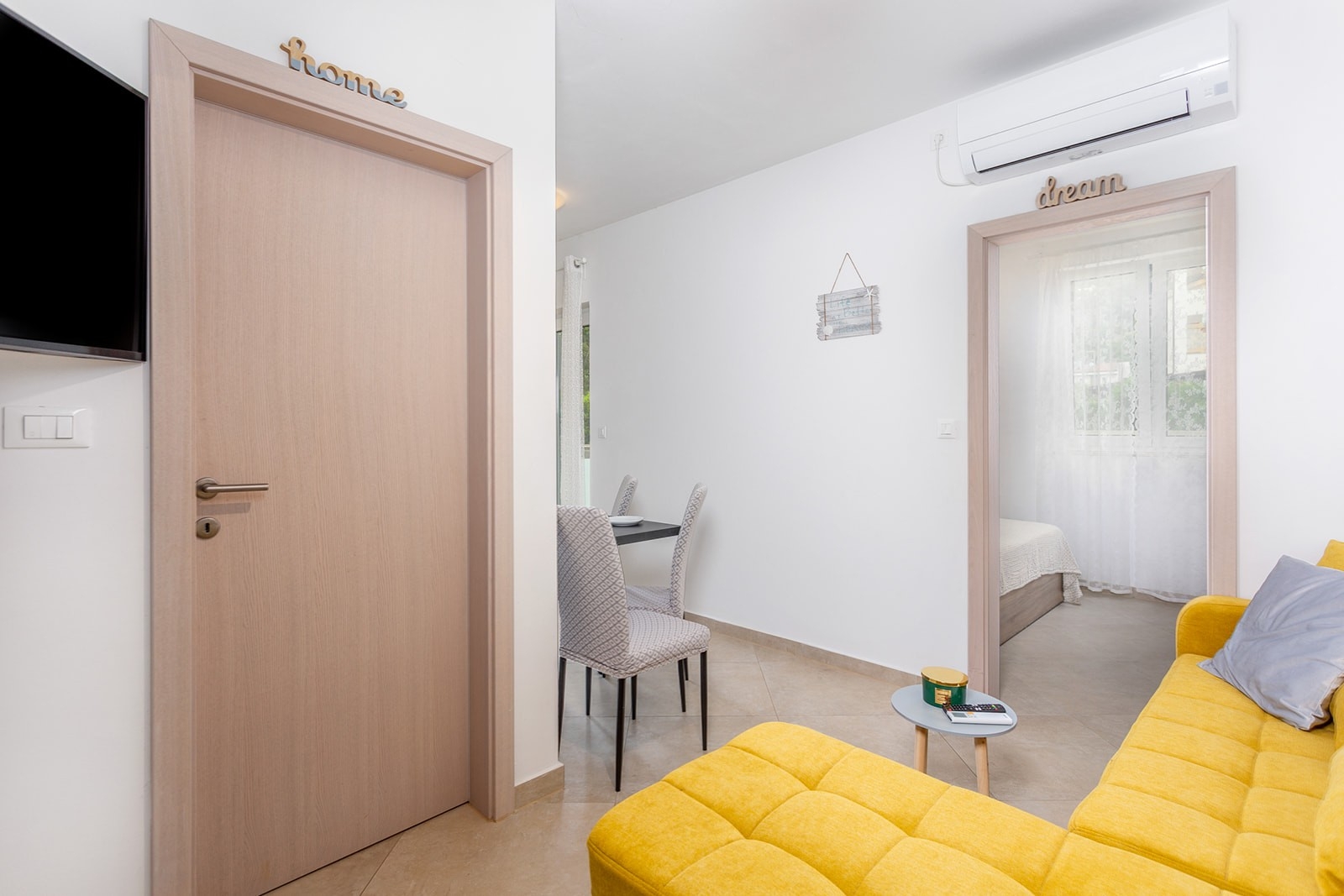 Apartment can accommodate 3 guests. Beds are situated in 1 sleeping rooms, but also in the living room, within 25m2. Guests can use a private balcony to enjoy the warm summer evenings. INCLUDED IN THE PRICE: tourist tax, final cleaning, air-conditioning, parking, internet, baby cot, hairdryer. The availability of additional services for your chosen dates of stay, as well as their prices (if none are listed) must be checked ahead of time. Any additional services not shown in the price calculation are payable directly to the property owner and only if used by the visitor.