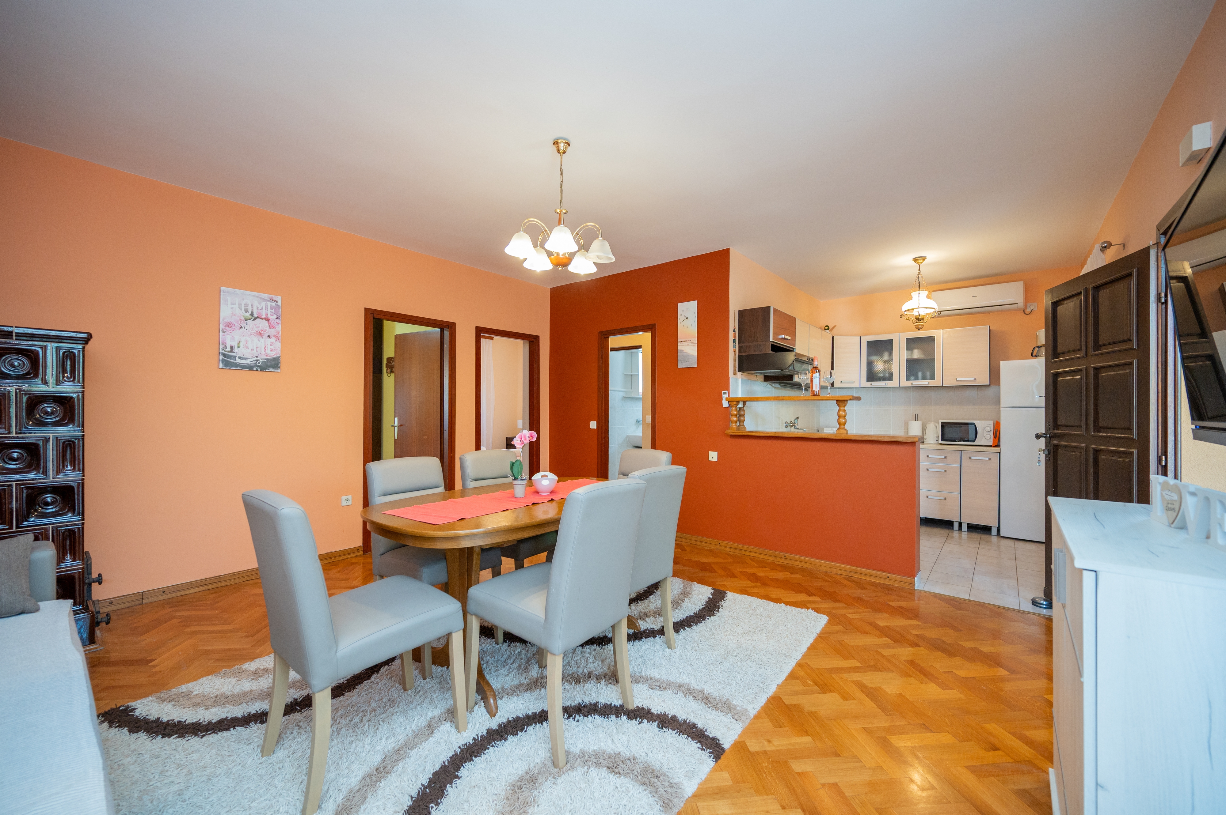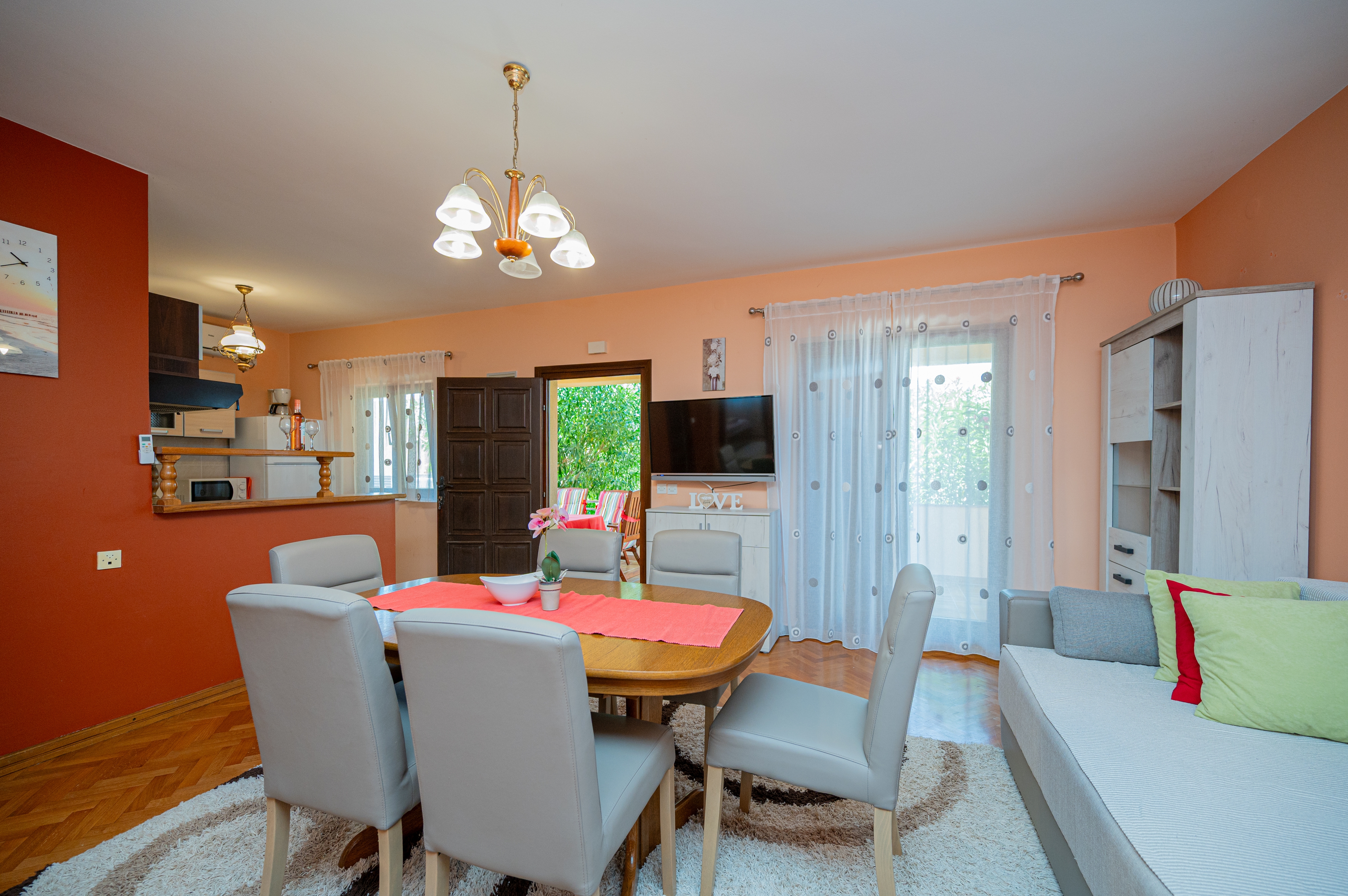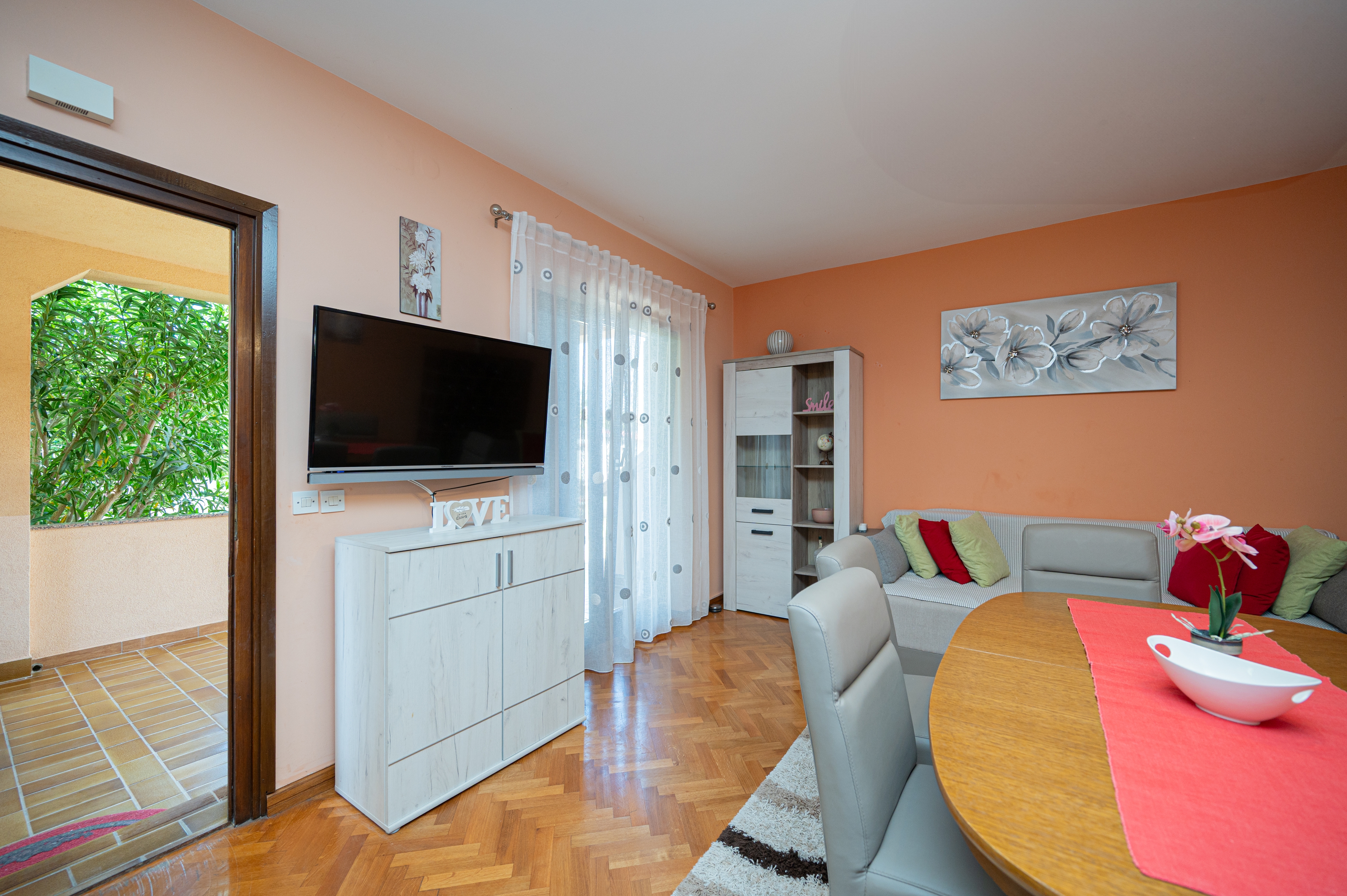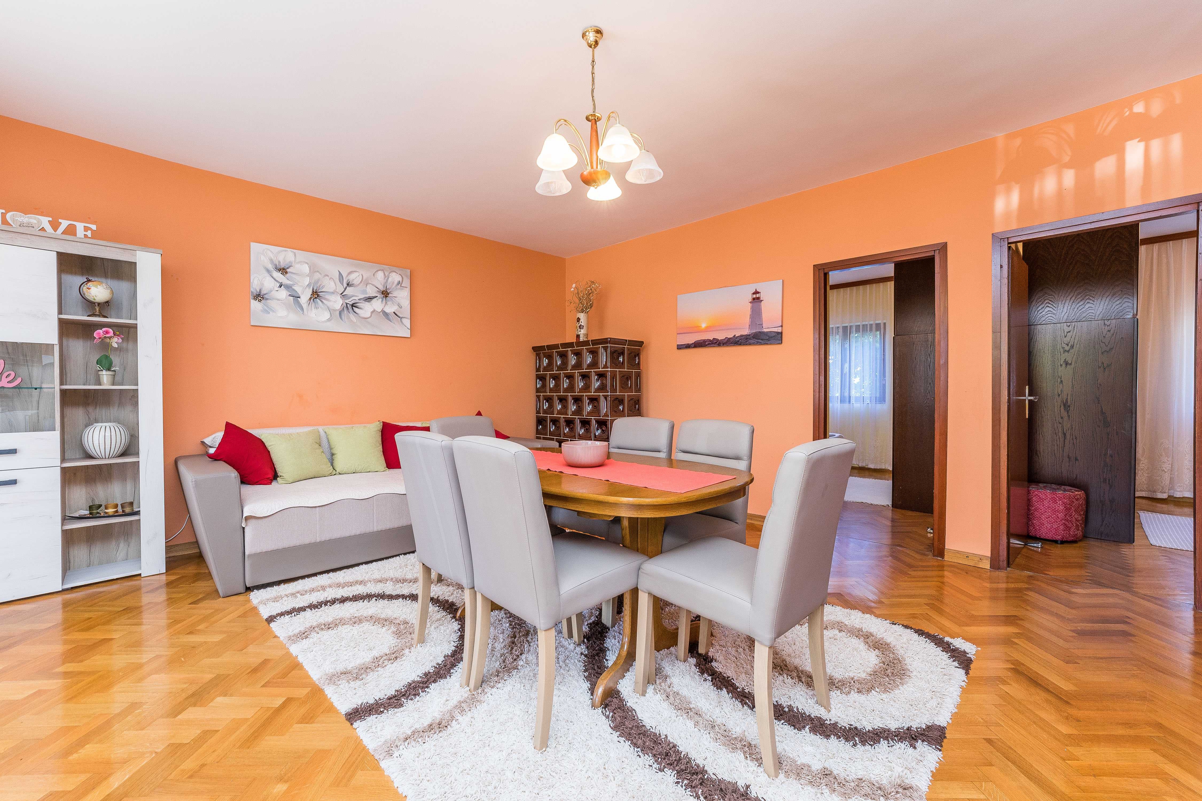 Apartment can accommodate 5 guests. Beds are situated in 2 sleeping rooms, but also in the living room, within 57m2. Guests can use a private terrace to enjoy the warm summer evenings. Food can be prepared using barbecue which is shared with other guests too. INCLUDED IN THE PRICE: tourist tax, final cleaning, air-conditioning, parking, internet, laundry, baby cot, iron, hairdryer. The availability of additional services for your chosen dates of stay, as well as their prices (if none are listed) must be checked ahead of time. Any additional services not shown in the price calculation are payable directly to the property owner and only if used by the visitor.